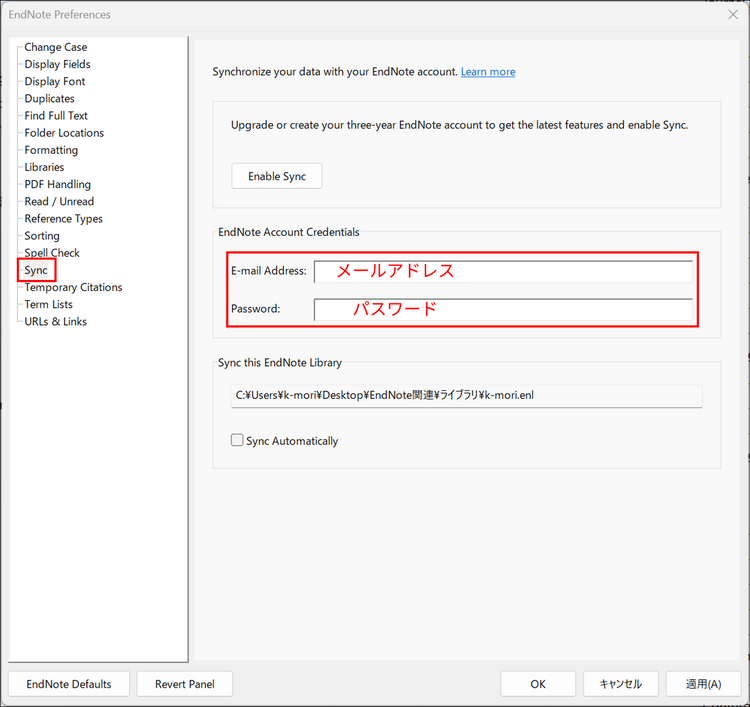 同期機能をご利用の場合、ウェブアカウントのメールアドレスやパスワードを更新した後は、デスクトップ版 EndNote の同期設定も更新する必要があります。