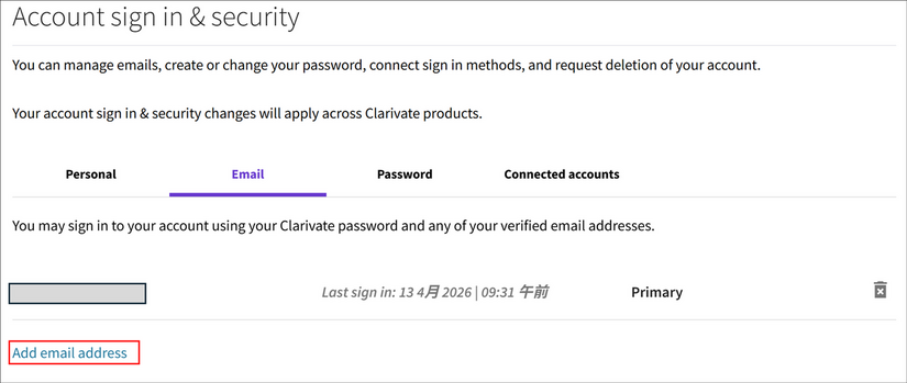 「Account sign in & security」画面が表示されたら、[Email] タブが選択されている状態で画面下方の [Add email address] をクリック