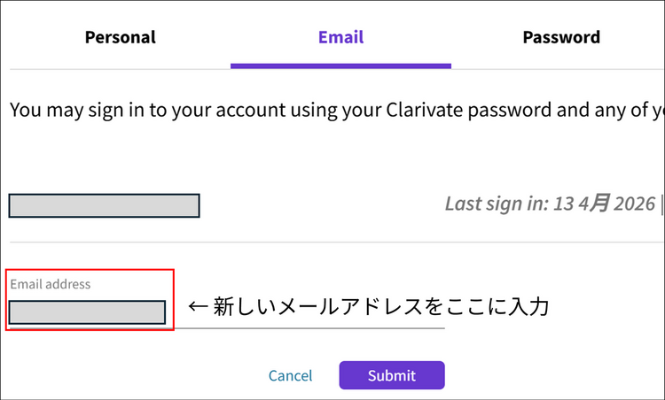 表示された入力欄に新しいメールアドレスを入力し、[Submit] ボタンをクリック