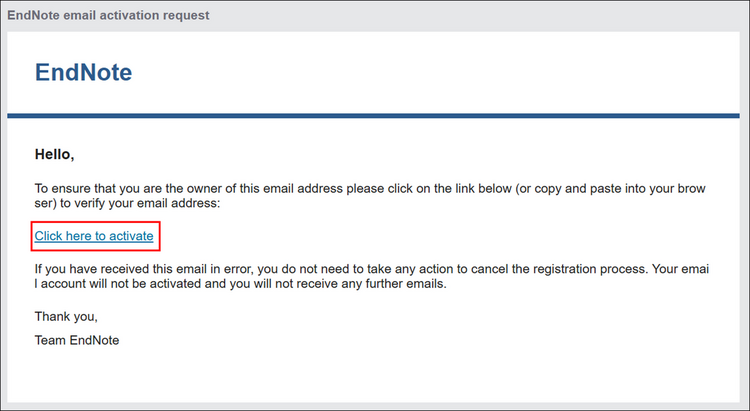 登録した新しいメールアドレス宛に認証メールが届きます。メールを開いて "Click here to activate" のリンクをクリックして認証を実行
