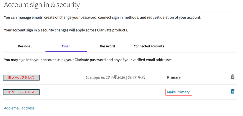 ※旧メールアドレスを削除する場合は、新しいメールアドレス欄に表示されている "Make Primary" をクリックして新しいメールアドレスを Primary に設定した上で、旧メールアドレス欄右側のごみ箱のアイコンをクリックして削除を実行してください。