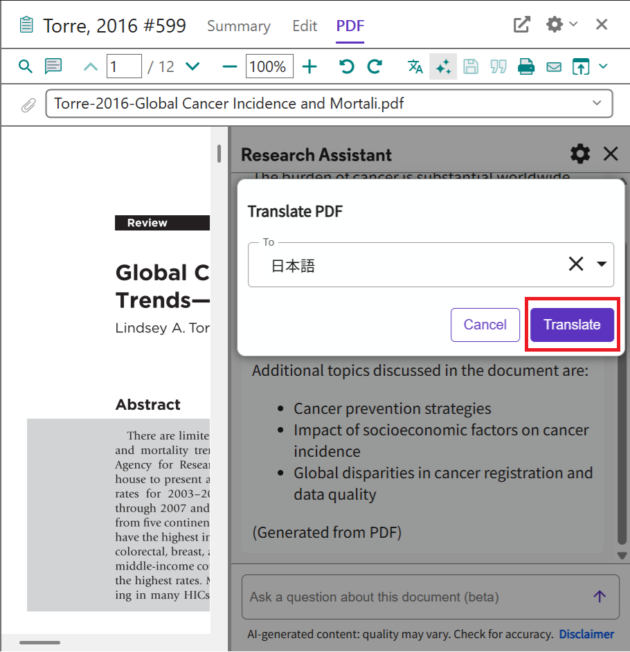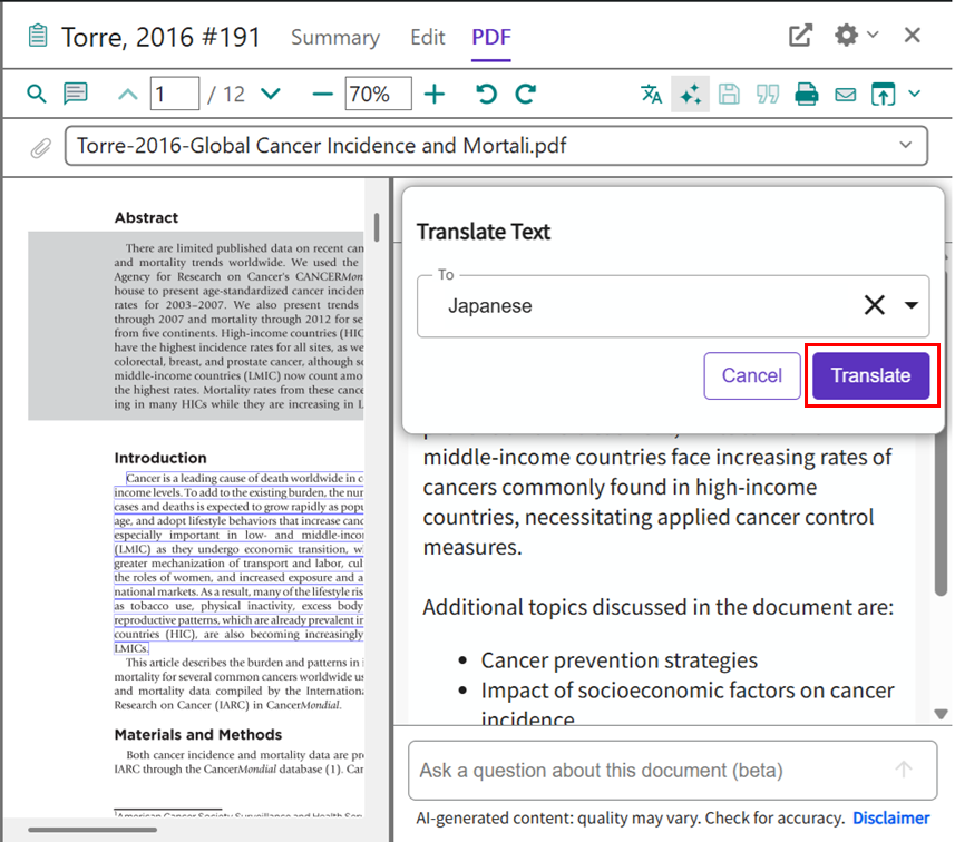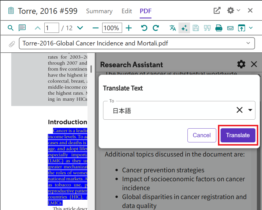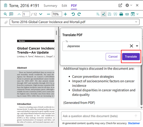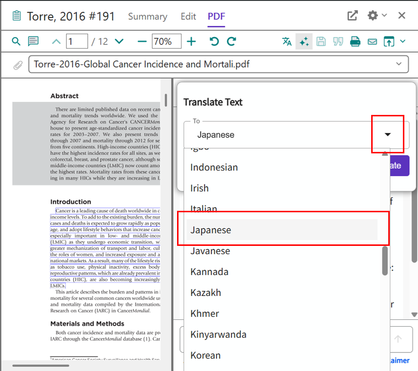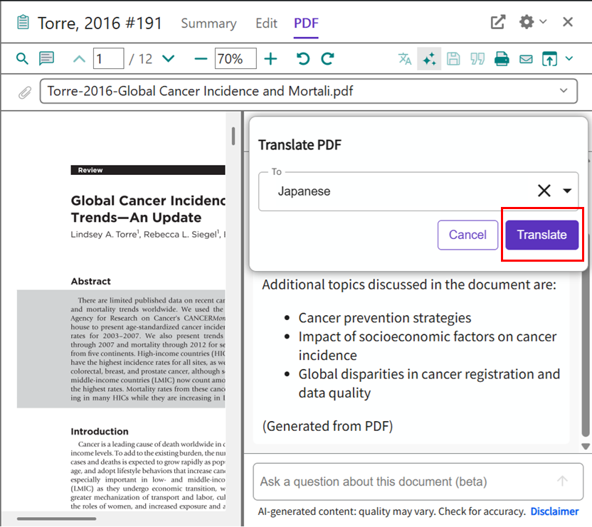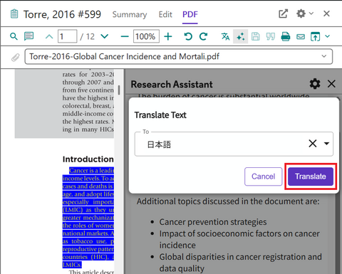 Translate your document 機能は論文 PDF が添付された文献レコードに対してのみ利用できます。テキスト認識できない PDF の場合は利用できません。