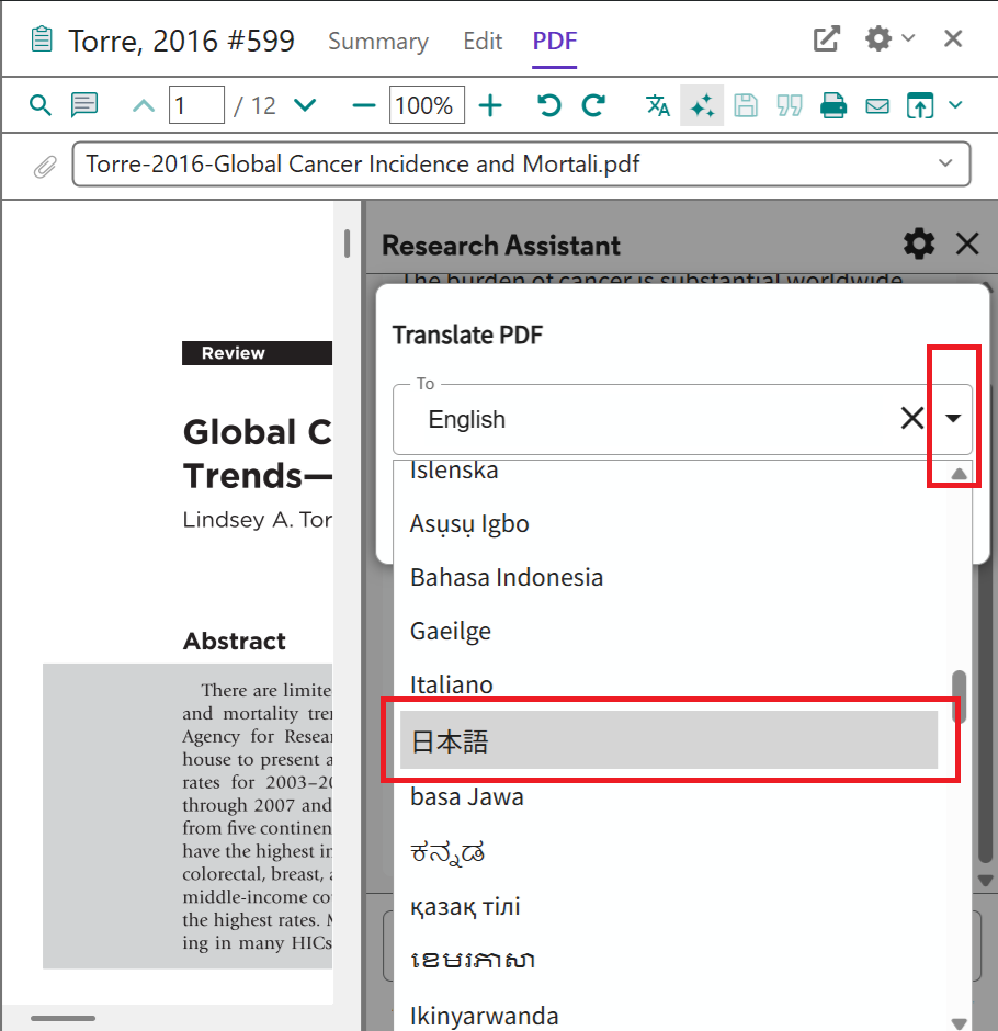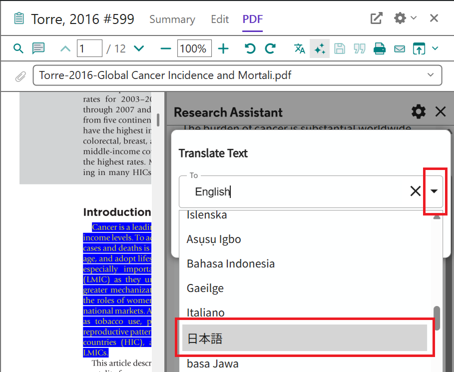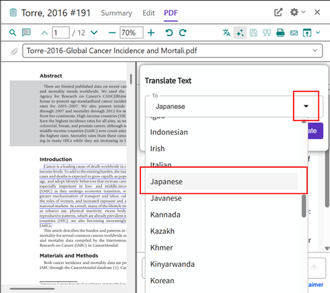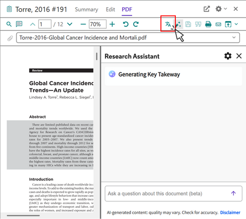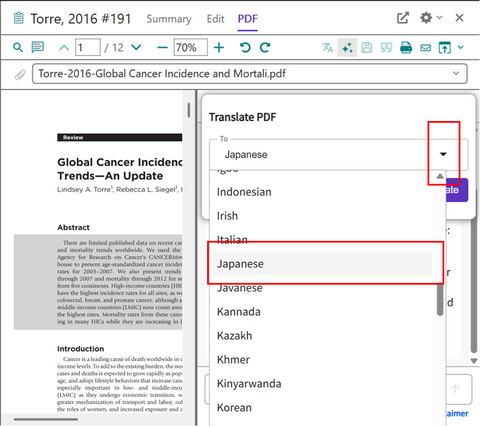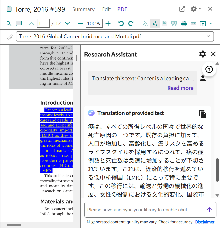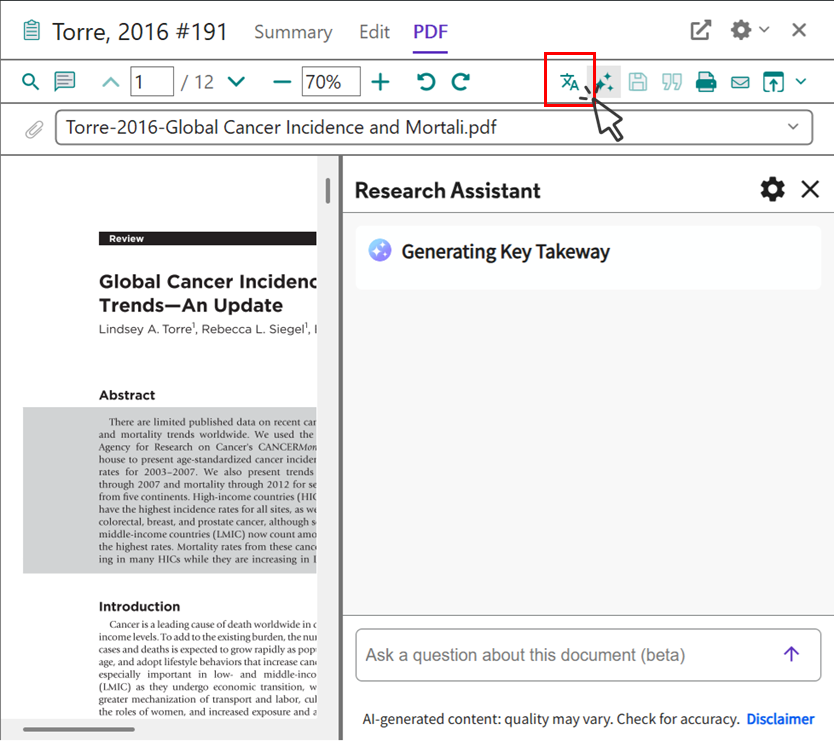 Translate your document 機能は論文 PDF が添付された文献レコードに対してのみ利用できます。テキスト認識できない PDF の場合は利用できません。