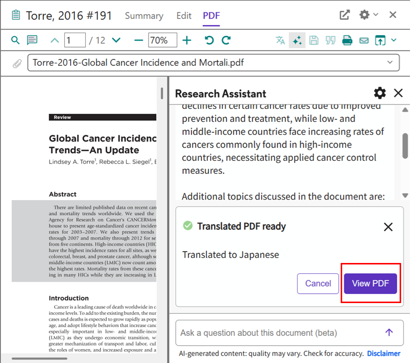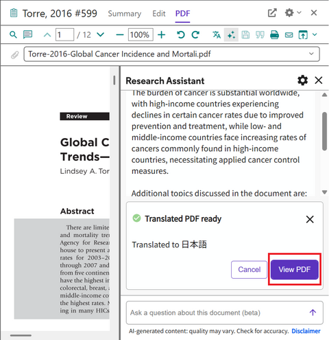 Research Assistant 画面下方にファイルの準備ができたというメッセージが表示されます。[View PDF] を選択して PDF を表示します。