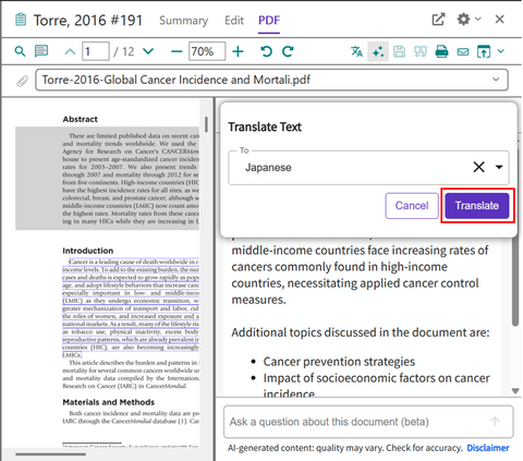 Translate your document とは、AI を活用し、論文 PDF の全体、または一部を翻訳する機能です。この機能を活用することで言語の壁を取り除くことができ、ユーザーが研究を新たな研究領域へと進めることを可能にします。