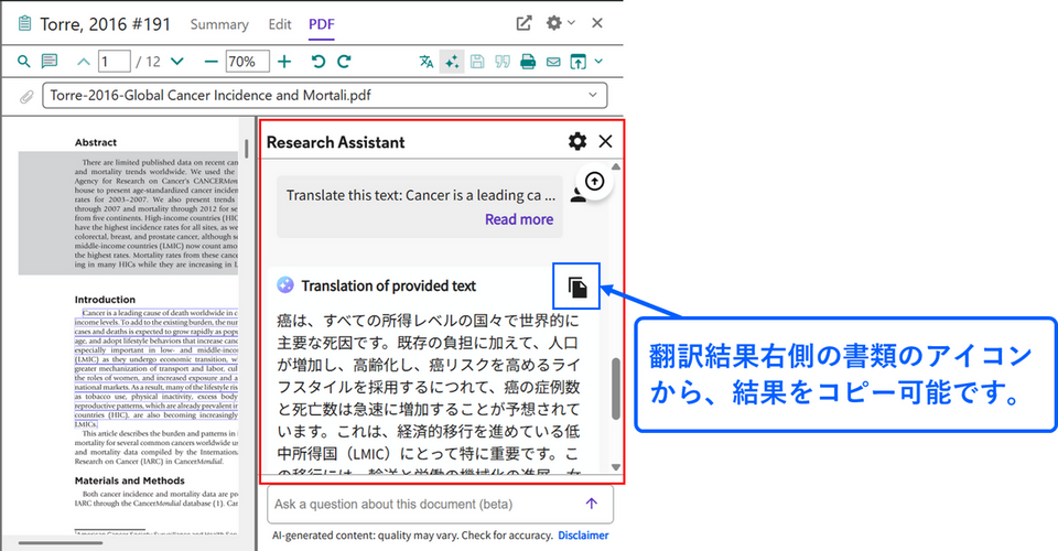 - PDF 画面上で文字選択して、右クリックから [Translate selected text] を選択することで選択部分のみを翻訳することも可能です。こちらは Research Assistant のチャット欄に結果が表示されます。作成される回答右側のドキュメントのアイコンをクリックするとコピーできるので、保存したい場合はテキストアプリなどにペーストして保存してください。