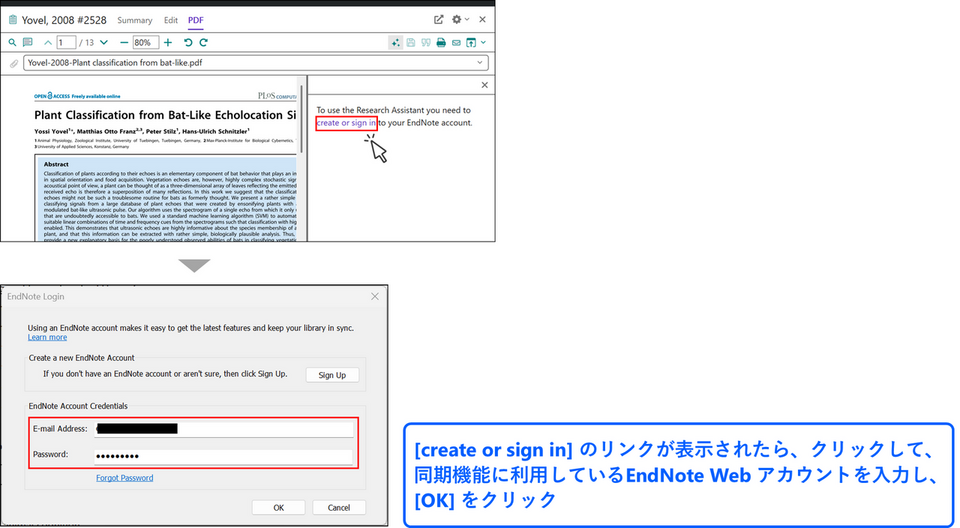 もし Research Assistant のアイコンをクリックした際に、[create or sign in] のリンクが表示された場合は、リンクをクリックして、EndNote Web のアカウントを入力してください。まだ、EndNote 2025 のライセンスでウェブアカウントの登録がお済みでない場合は、Sign Up のボタンからアカウント登録をしてください。