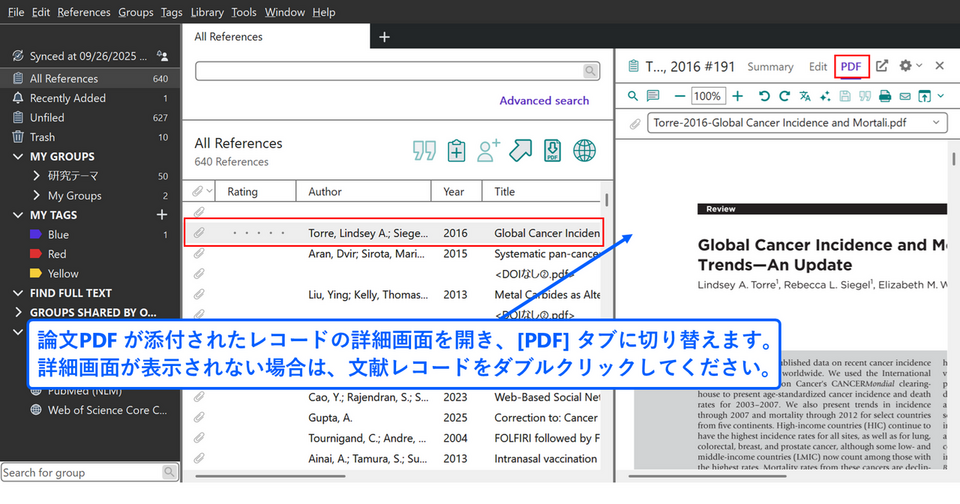 論文 PDF が添付された文献レコードの詳細画面を開き、[PDF] タブに切り替え