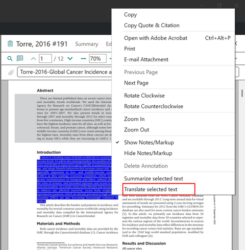 PDF 内で翻訳したい文章を選択して右クリックし、[Translate selected text] を選択