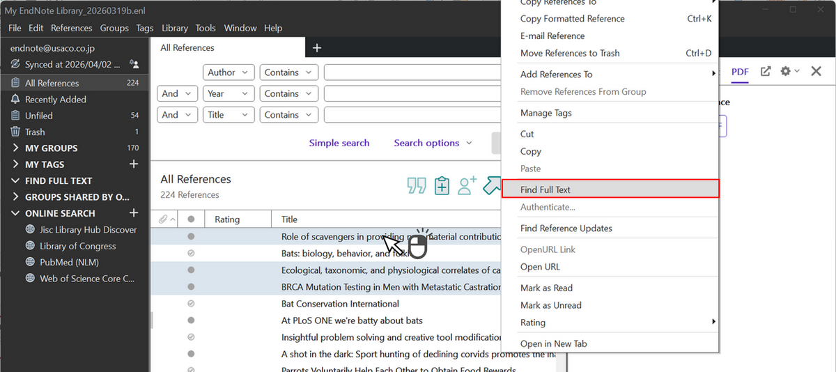 Find Full Text とはライブラリに登録されている書誌情報をもとに、EndNote がウェブ上から PDF を探し出して自動添付してくれる便利な機能です。