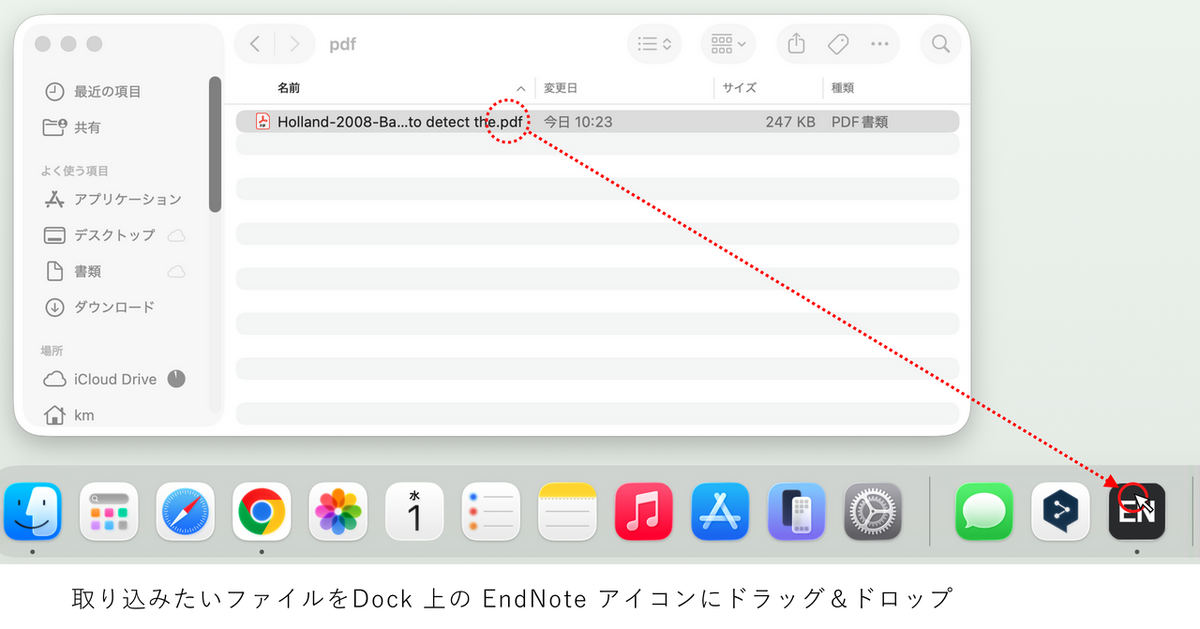 PDF ファイルの保存先から、取り込みたいファイルをDock 上の EndNote アイコンにドラッグ&ドロップします。
