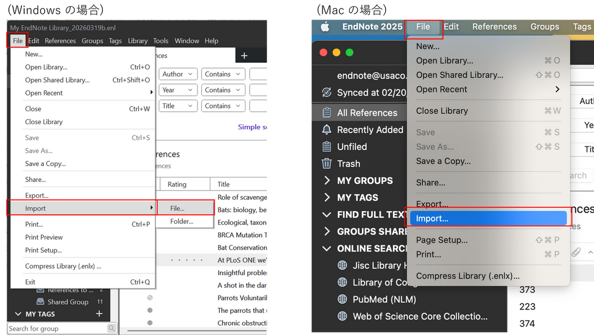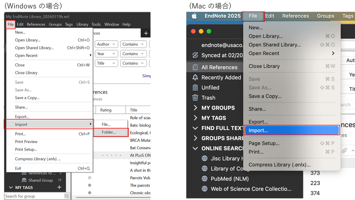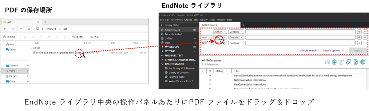 デスクトップやPC のフォルダに保存してあるPDF を、今すぐEndNote に取り込みたい場合に最適かつ最も直感的な方法です。ご利用の OS によって操作方法が異なります。