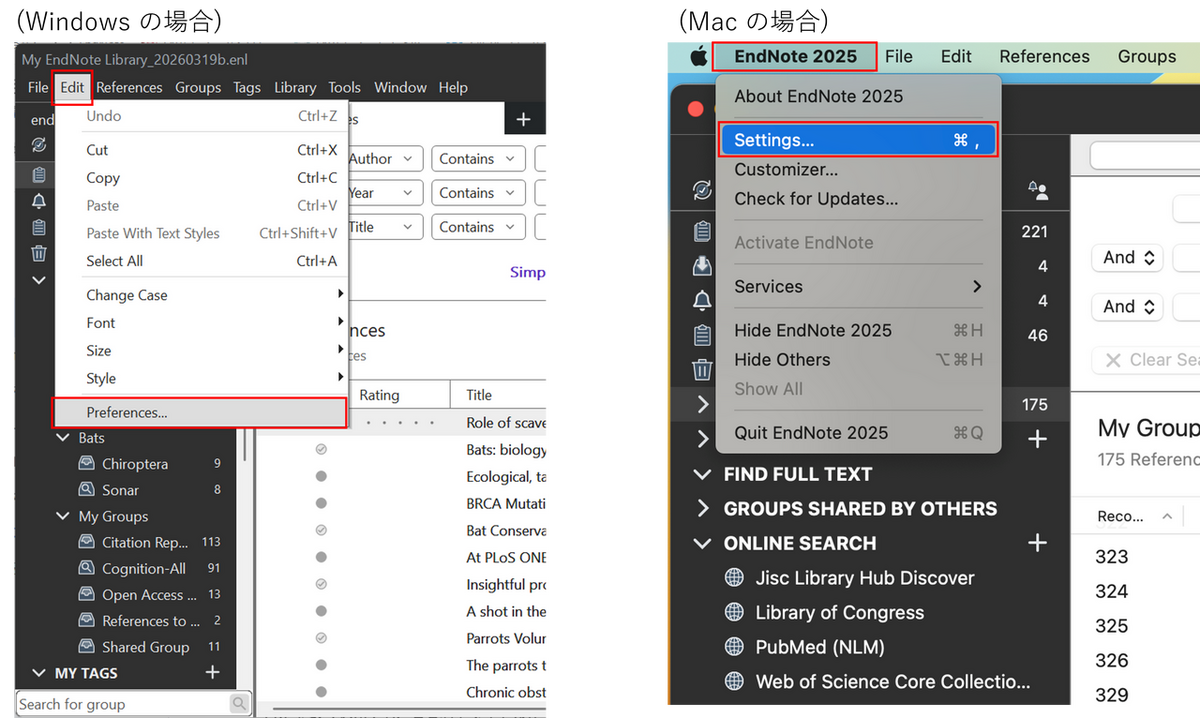 メニューの [Edit] → [Preferences...](Mac の場合は [EndNote 2025] → [Settings...] または [Preferences...])を開きます。