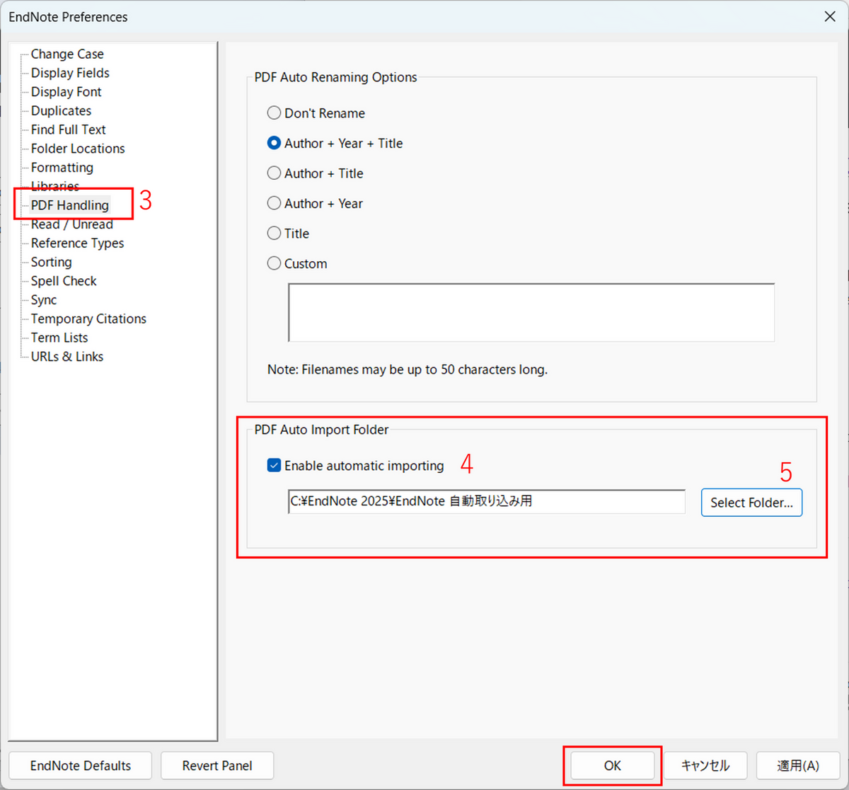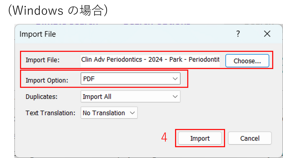 ※ここが「EndNote Library」などのデフォルト設定のままだと、PDF を正しくインポートできません。間違いやすいポイントですのでご注意ください。