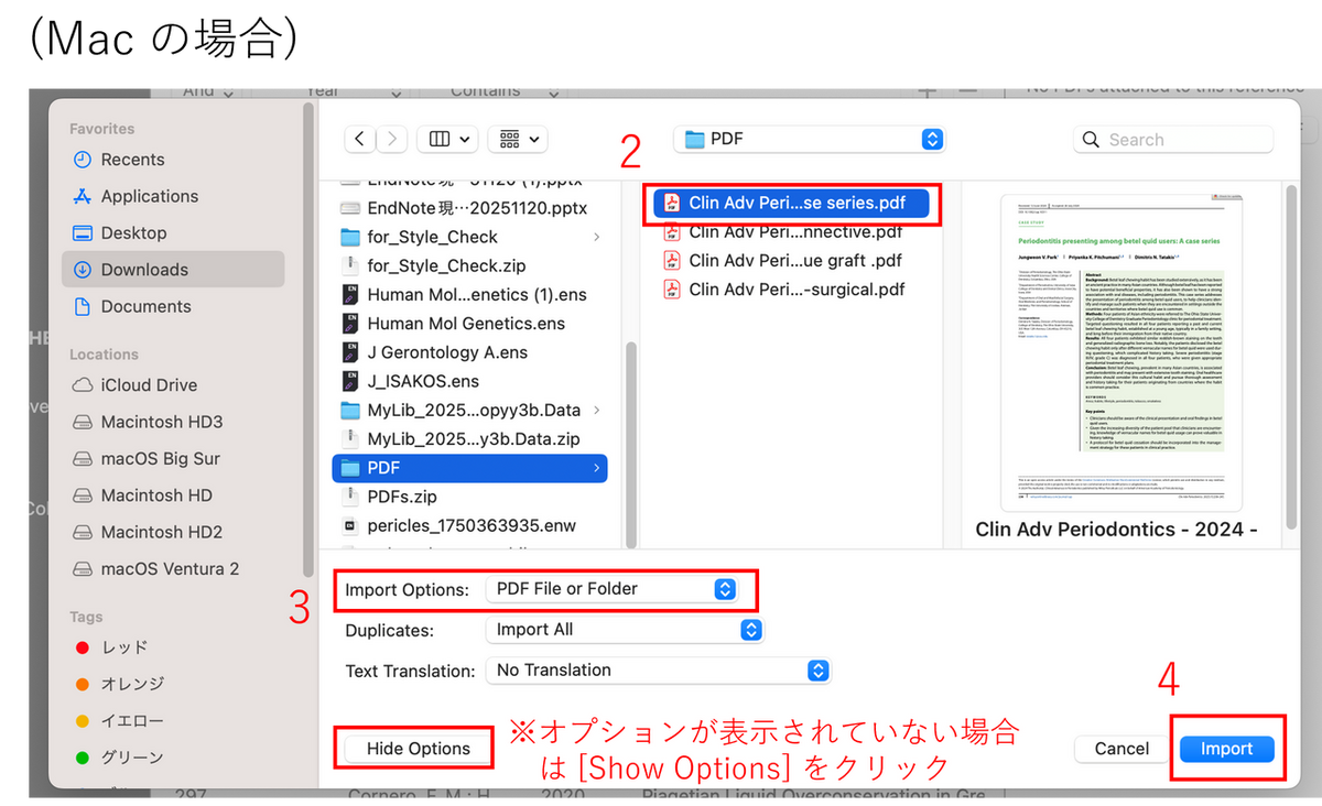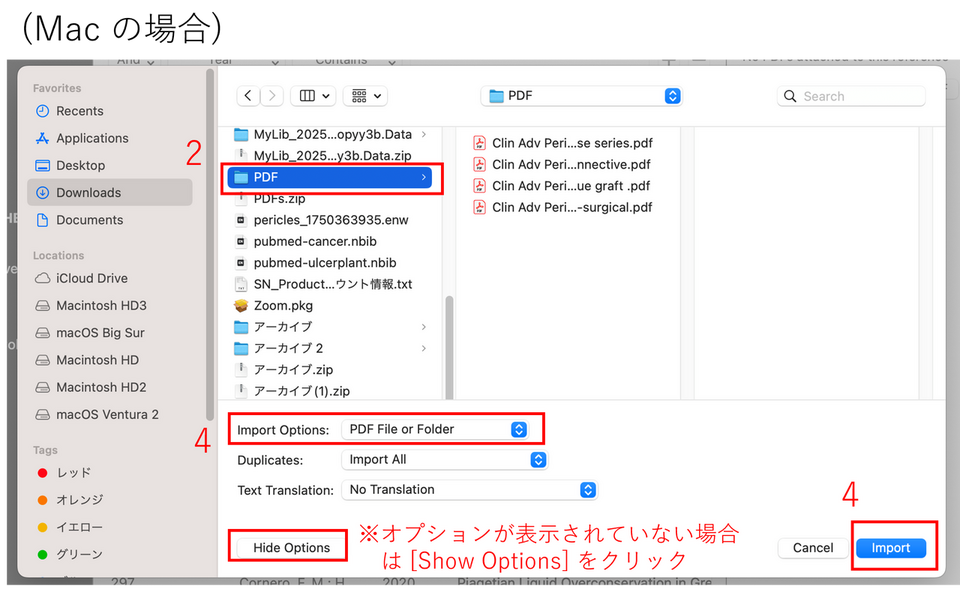 [Import Option] で「PDF」 を選択(Mac の場合は左下の [Show Options] をクリックしてオプション項目を表示し、[Import Options] を 「PDF File or Folder」 を選択)