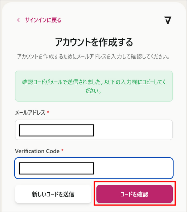 [Verification Code] 欄に送られてきたコードを入力し、[コードを確認] をクリック