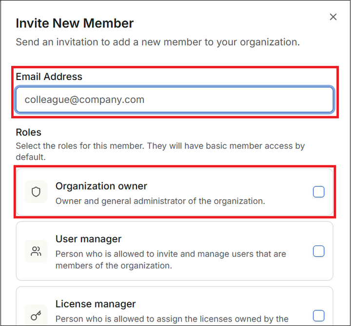 [Email Address] に、新しいメールアドレスを入力し、その下の [Roles] 項目で [Organization Owner] を選択