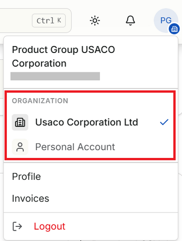 もし購入されたライセンス情報が表示されない場合、別のサブアカウントに付与されている可能性があります。画面右上イニシャルアイコンをクリックし、[ORGANIZATION] 欄にて別のアカウントへの切り替えが可能どうかをご確認ください。別のアカウントへ切り替えることができたら、再度 [Licenses] をご確認ください。