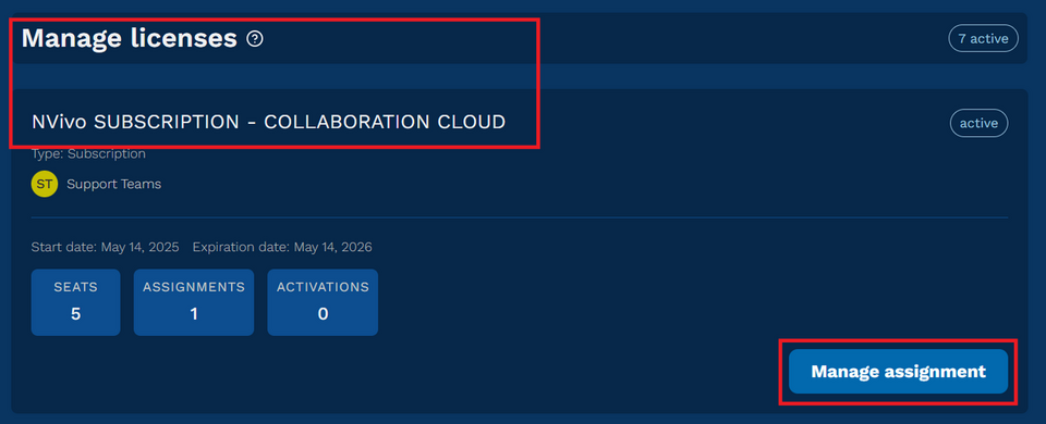 画面下方 [Manage Licenses] を確認し、[NVivo Collaboration Cloud] 項目の [Manage Assignment] をクリック