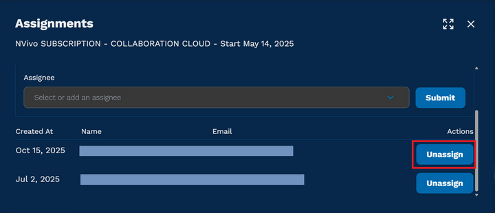 - [Unassign] をクリックするとそのユーザーを NVivo Collaboration Cloud のメンバーから削除することができます。