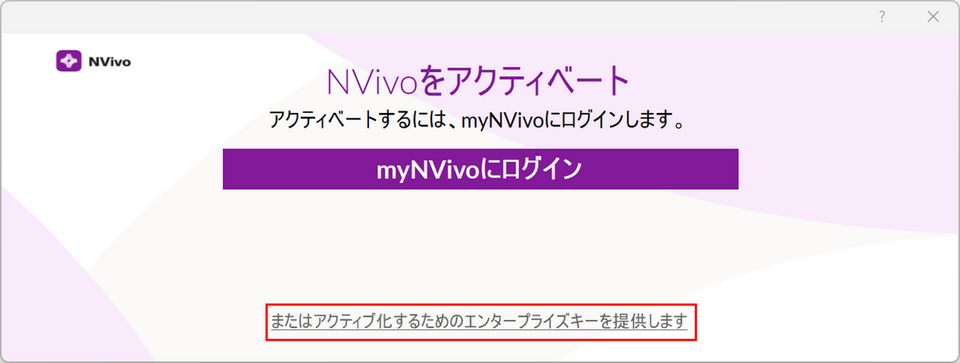 NVivo を起動し、myNVivo へのログイン画面下部にある「またはアクティブ化するためのエンタープライズキーを提供します」のリンクをクリック