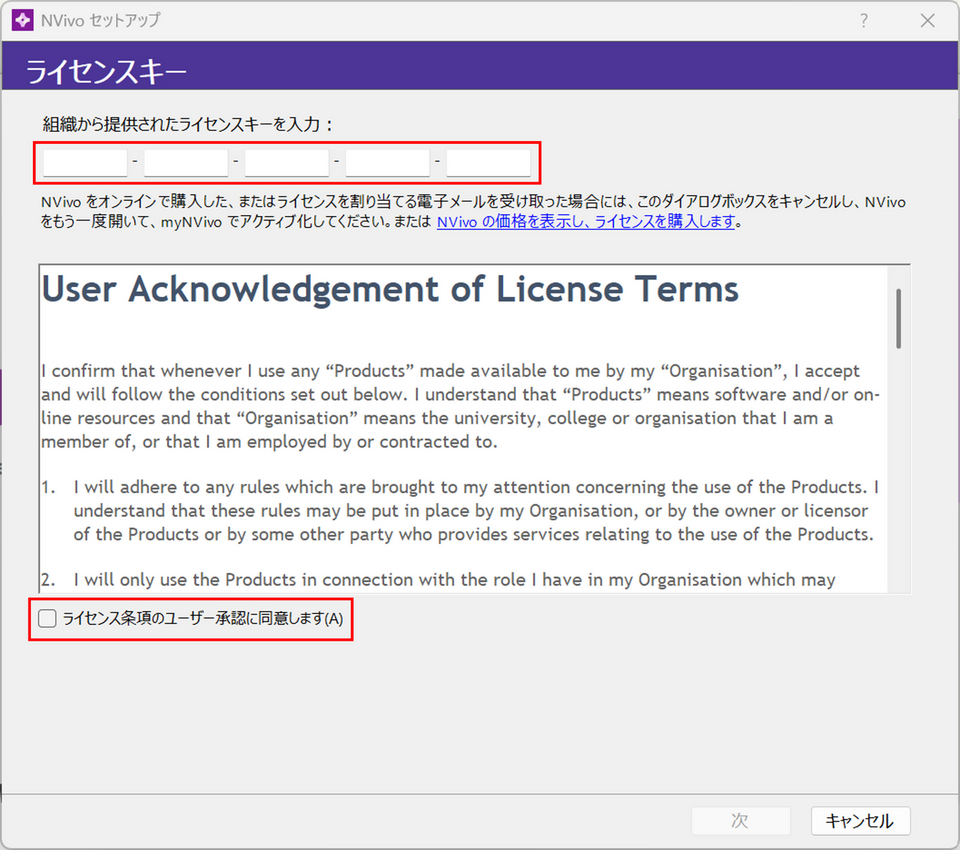 ライセンス契約の同意チェックボックスにチェックを入れ、[次] をクリック