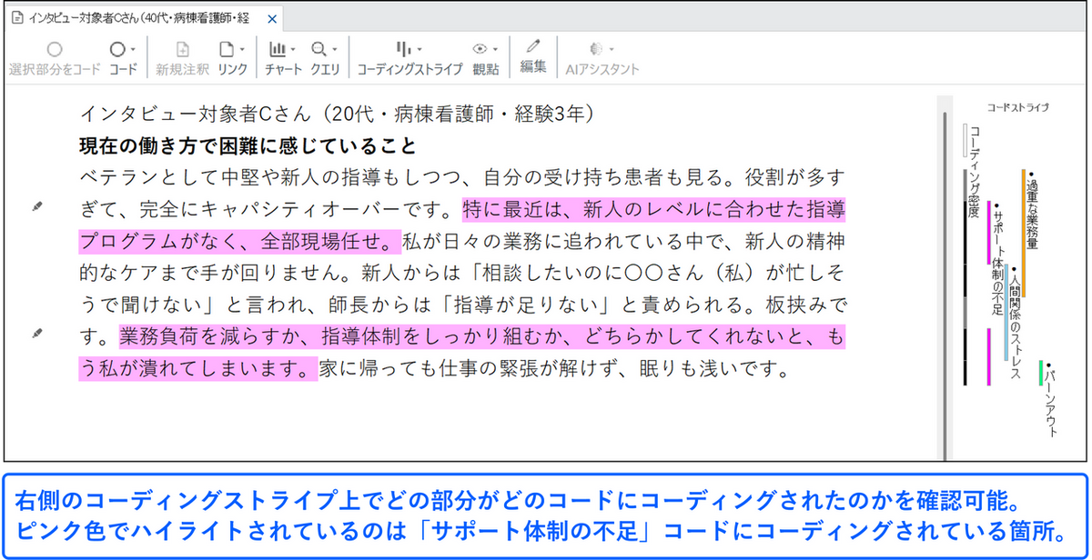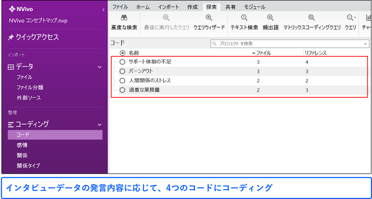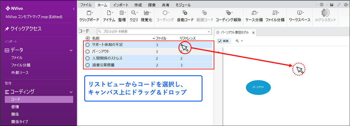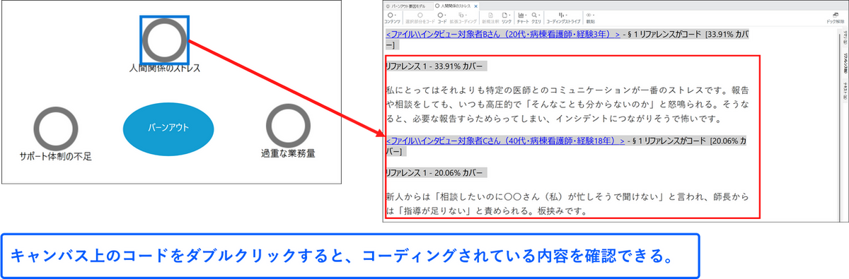 マップに追加されたコード(「人間関係のストレス」など)をダブルクリックすると、そのコードにコーディングされた看護師の具体的な発言(上記サンプルデータ該当箇所)をすぐに確認できます。これにより、思考(マップ)とデータ(引用)を常に行き来しながら分析を深めることができます。