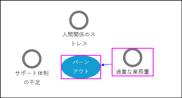 「過重な業務量」のコードをクリックし、「バーンアウト」の図形までドラッグして矢印を引く