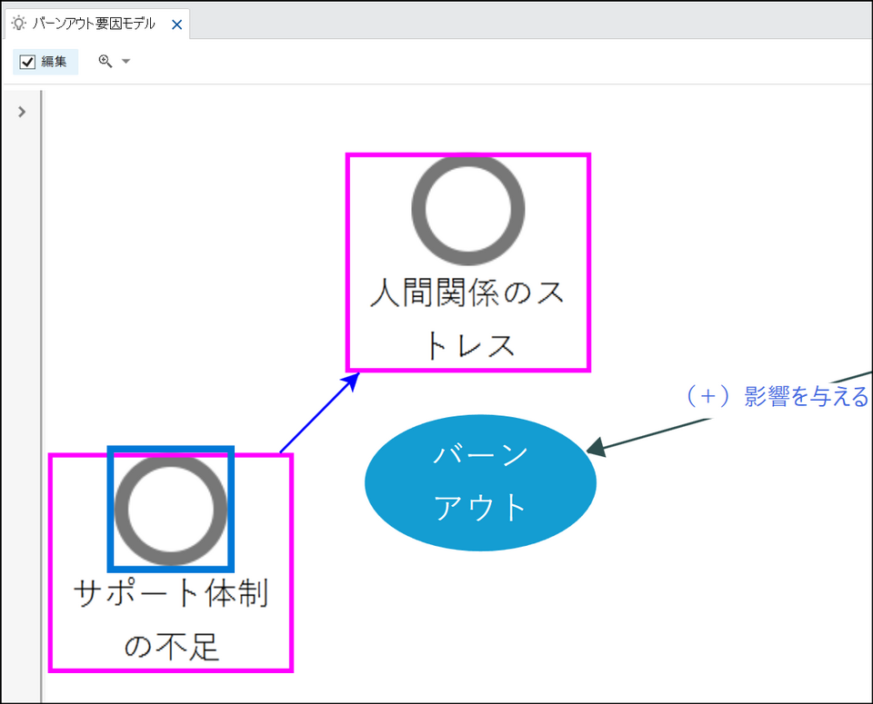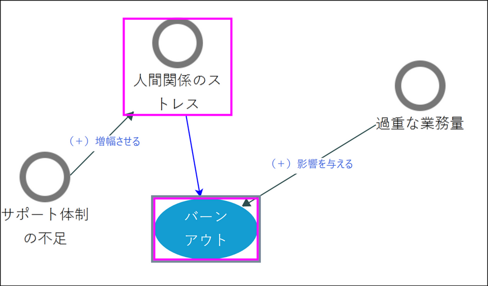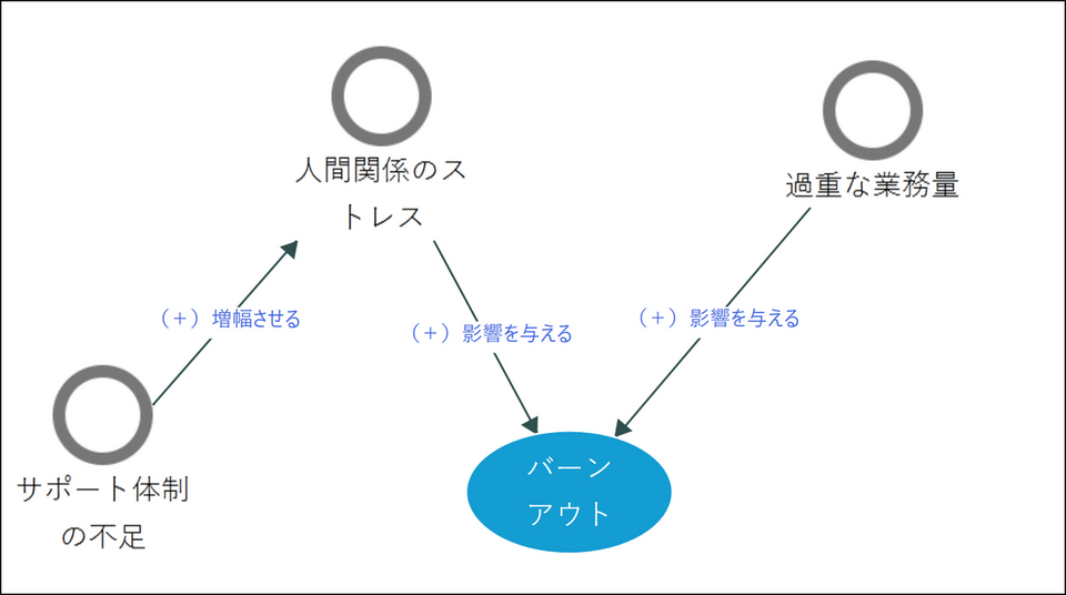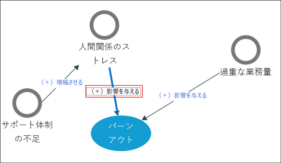 「人間関係のストレス」から「バーンアウト」へも矢印を引き、「(+)影響を与える」とラベル付けする