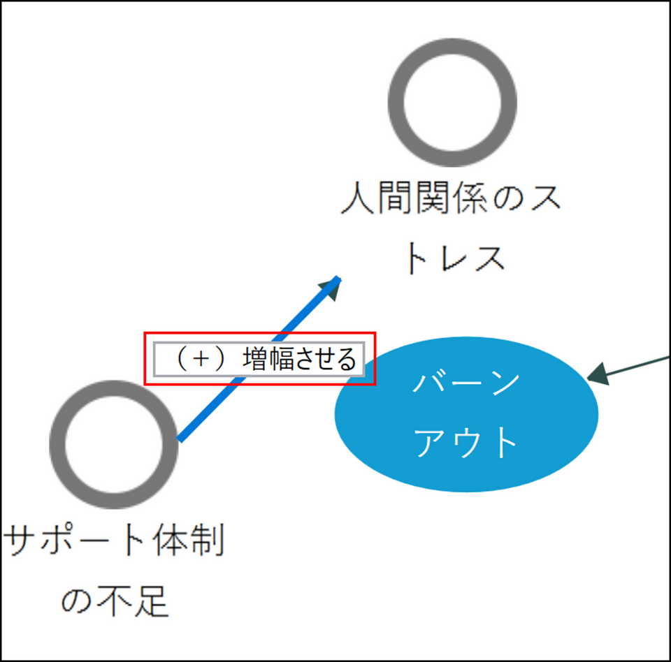 対象者B やC の語りから、「サポート体制の不足」が「人間関係のストレス」を強めていると判断し、「サポート体制の不足」コードから「人間関係のストレス」コードへ矢印を引き、「(+)増幅させる」とラベル付けする
