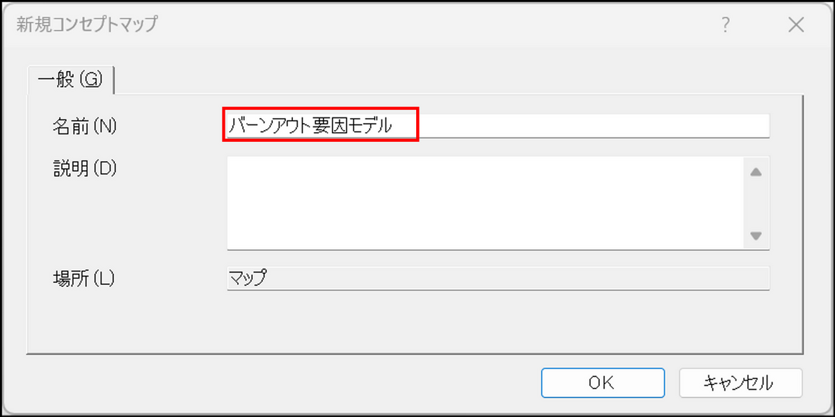 マップの名前(例:「バーンアウト要因モデル」)を入力して、[OK] をクリック