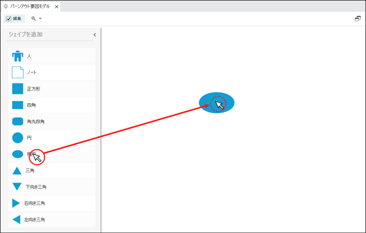 左側の [シェイプを追加] パネルを開き、「楕円」をキャンバスの中央にドラッグします。