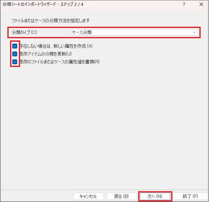 [分類タイプ] を [ケース分類] に変更し、その他の項目にすべてチェックを入れ [次へ] をクリック