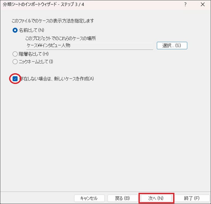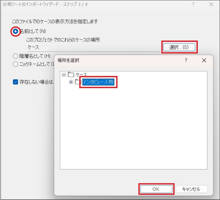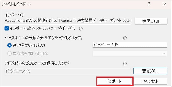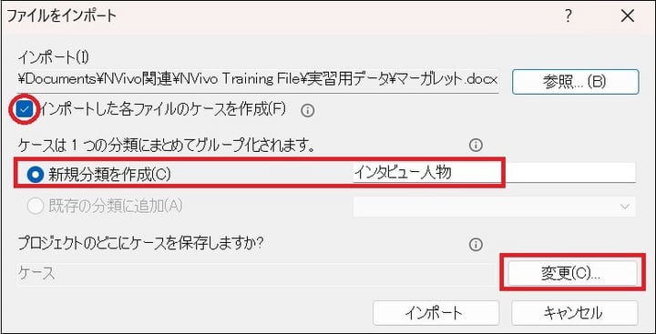 [インポートした各ファイルのケースを作成] にチェックを入れ [新規分類を作成] を選択し分類名(例:インタビュー人物)を入力