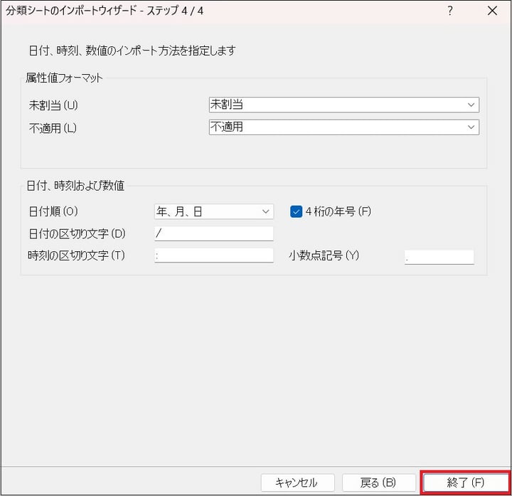 必要に応じて日付等の表示形式を設定し [終了] をクリック
