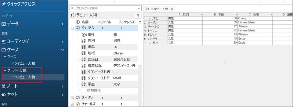 NVivo では、それぞれのインタビューデータに「ケース」を作成し、年齢、性別、職業、居住地といった回答者の属性情報を追加することが可能です。また、設定した属性情報を利用し、データ分析をより深く、多角的に行うことができるようになります。