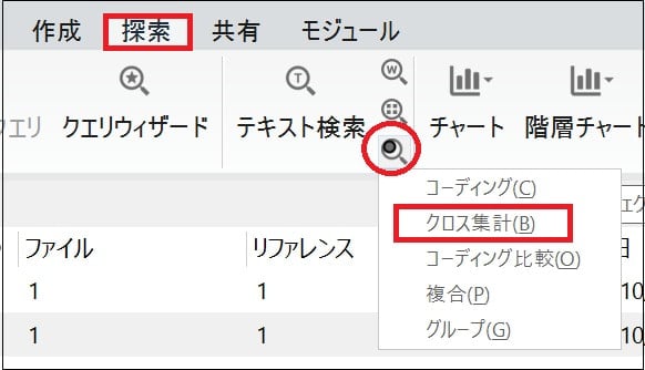 メニューの[探索] タブの虫眼鏡アイコンをクリックし、[クロス集計] を選択