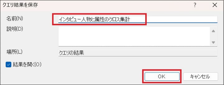 出現した画面にてクエリの結果名を入力し [保存] をクリック