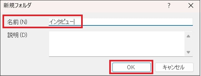 出現した画面の名前欄に任意のフォルダ名(例:インタビュー)を入力し、[OK] をクリック