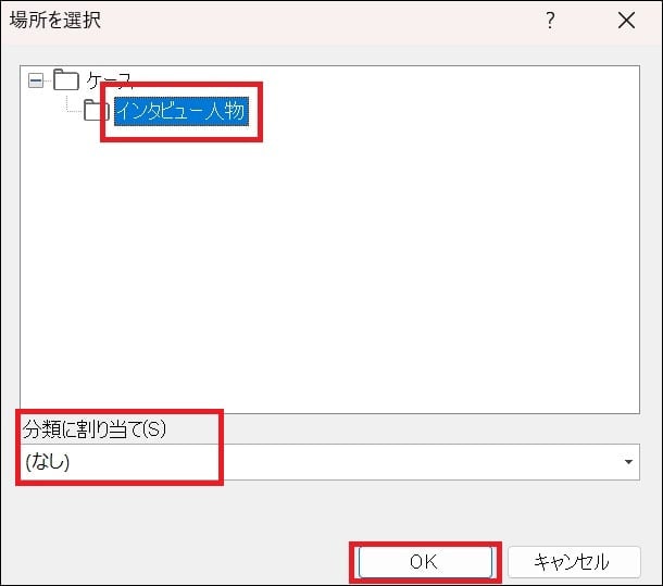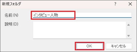 出現した画面で名前欄に任意のフォルダ名(例:インタビュー人物)を入力し、[OK] をクリック