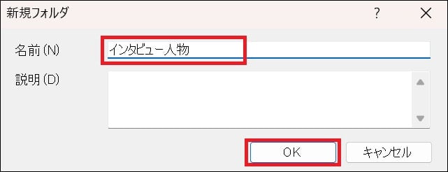 出現した画面の名前欄に任意のフォルダ名(例:インタビュー人物)を入力し、[OK] をクリック