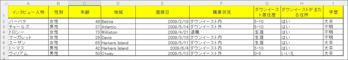 1行目には「年齢」「性別」「職業」などの属性名(ヘッダー)を記載します。 - A列には対象者のインタビューファイル名