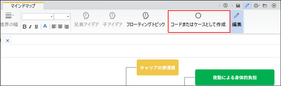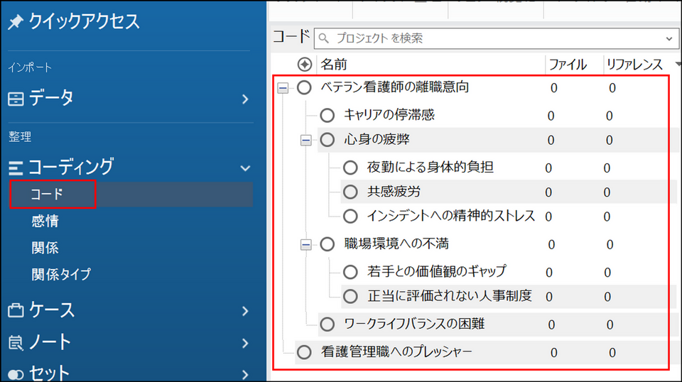 この操作により、マインドマップの階層構造(親子関係)がそのままコードとして作成されます。例えば、事例では「心身の疲弊」という親コードの下に「共感疲労」などの子コードが自動で作成され、すぐにデータ分析に利用できます。