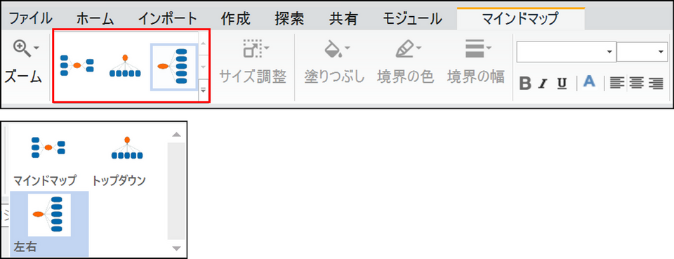 作成したマインドマップは、見やすいようにレイアウトやデザインを自由に変更できます。思考を整理する段階や、プレゼンテーション用に整える際に活用しましょう。これらの設定はすべて「マインドマップ」タブから行います。