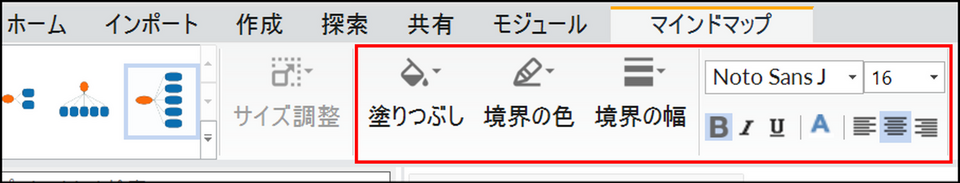 変更したいアイデア(図形)を選択してから、リボンメニューの各項目を調整します。