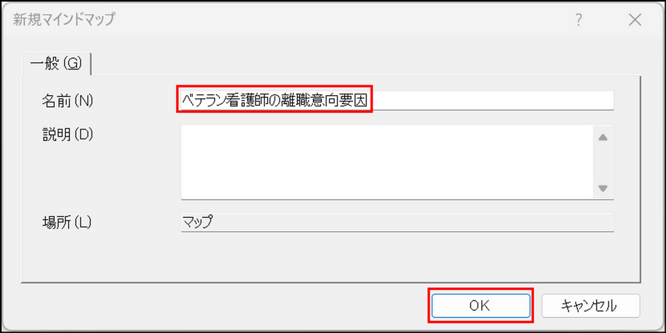 マインドマップの名前(例:「ベテラン看護師の離職意向要因」)を入力して、[OK] をクリック
