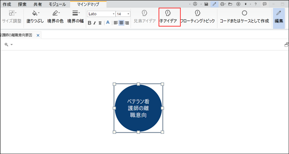 続いて離職意向の背景にある大きな要因を「子アイデア」として追加します。マップ上のアイテムを選択した状態で、メニューの [マインドマップ] タブの[子アイデア] をクリック(またはキーボードの [Insert] を押下)