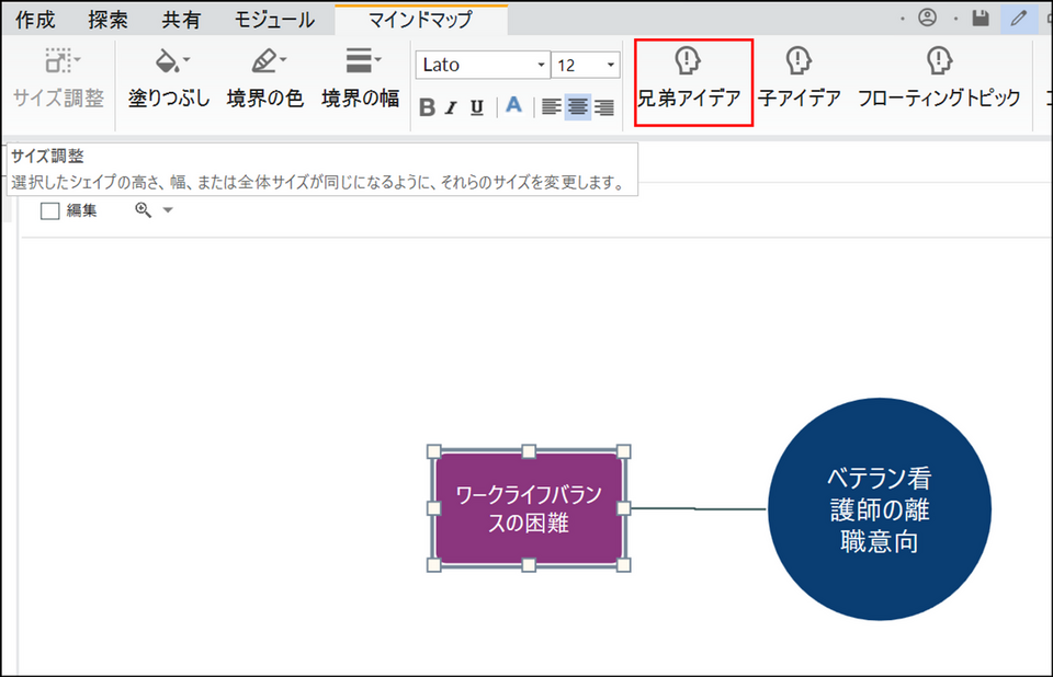 続いて、同じ階層に他のカテゴリ(「キャリアの停滞感」、「心身の疲弊」、「職場環境への不満」など)を追加します。手順5 で追加したカテゴリを選択した状態で [兄弟アイデア] をクリックします。(または、キーボードの [Enter] を押下)