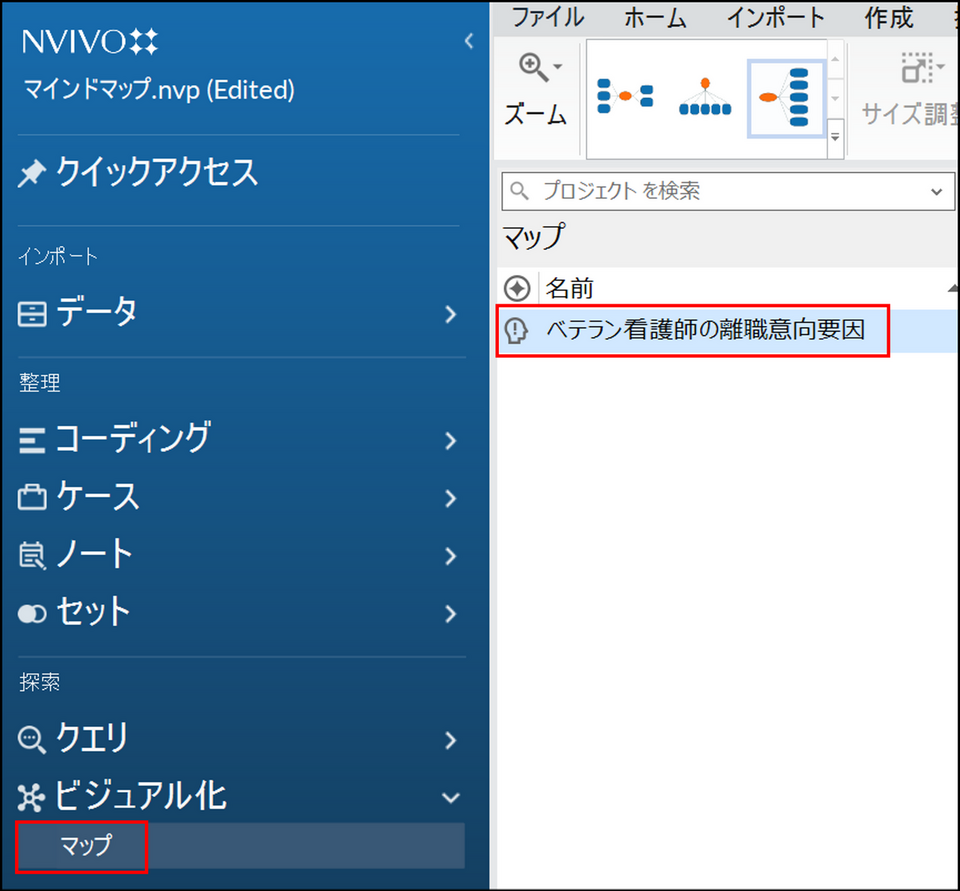 作成したマインドマップは、ナビゲーションビューの[ビジュアル化] > [マップ] フォルダに保存されます。フォルダ内に保存されているマインドマップをダブルクリックすると、詳細ビューで再び表示できます。