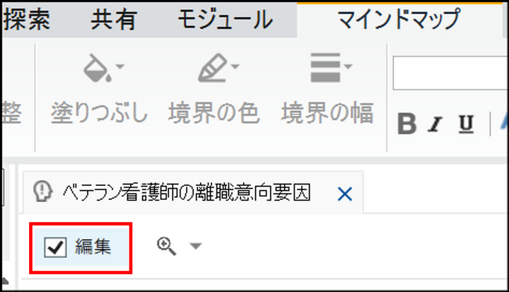 再度開いたマインドマップは、デフォルトでは閲覧モードになっています。内容を編集したい場合は、詳細ビューの左上にある「編集」のチェックボックスにチェックを入れる必要があります。チェックを入れると、アイデアの追加やデザインの変更が可能になります。